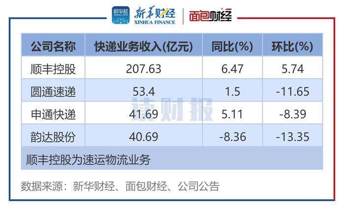 从同比变化来看,4家快递公司仅韵达股份一家同比下降,降幅为8.36%。另外三家均保持增长,其中,顺丰控股的业务收入同比增幅最高,达6.47%。