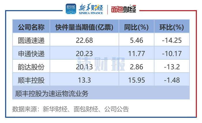 从同比变动来看,4家快递公司业务总量均有所增长,其中,顺丰控股的增幅最大,达15.95%;申通快递的增幅位居第二,达11.77%。
