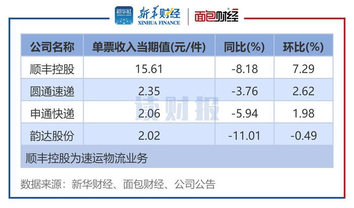 从单票收入来看,顺丰控股的1月单票收入为15.61元/件,圆通速递、韵达股份及申通快递的单票收入均在2元/件至3元/件之间。